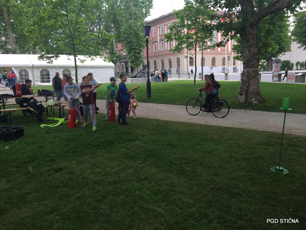 Na naši delavnici so se obiskovalci preizkusili v zbijanju tarče z vedrovko in si ogledali opremo operativnega gasilca.