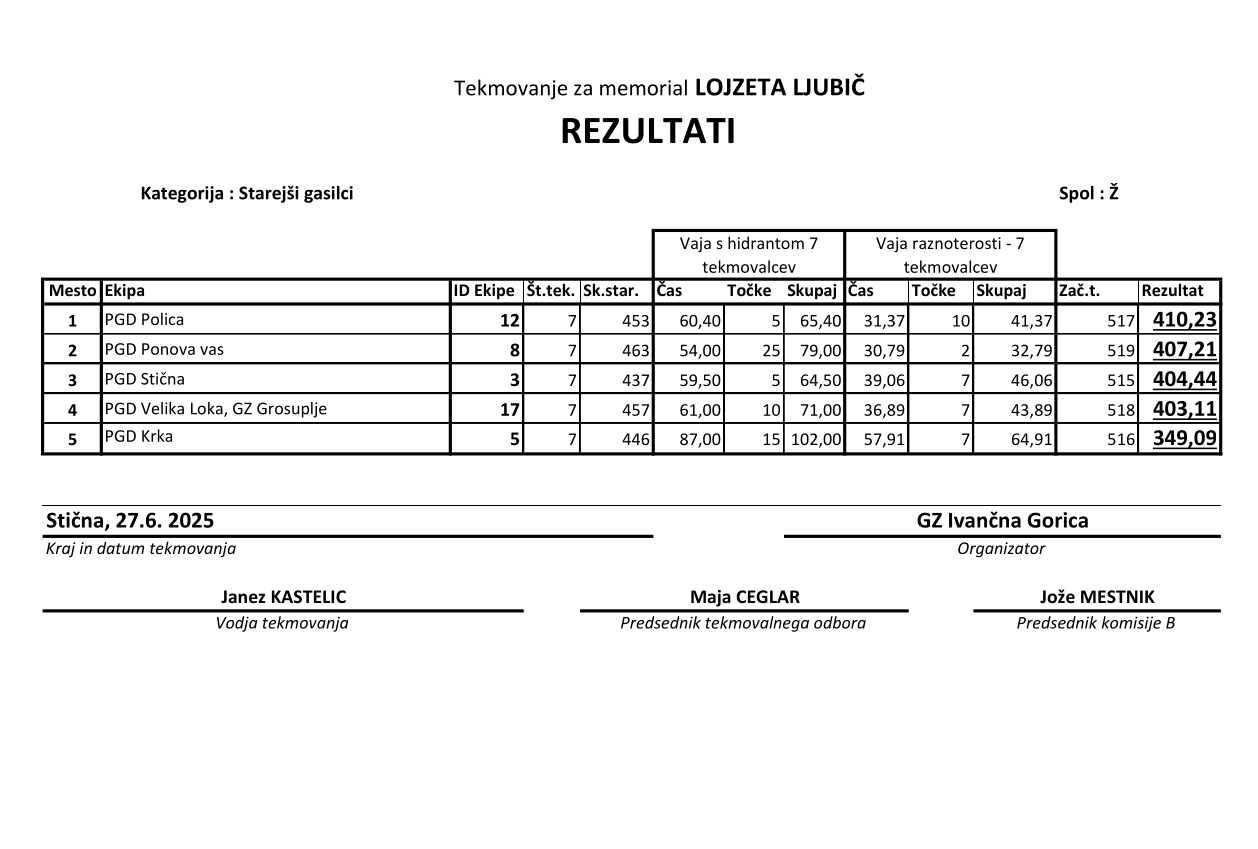 Hvaležna sem Gasilski zvezi Ivančna Gorica, da se je odločila počastiti spomin na mojega očeta z organizacijo tekmovanja starejših gasilk in gasilcev ter gasilskemu društvu Stična za soorganizacijo tekmovanja.