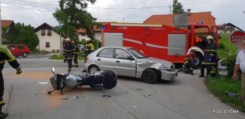 Trčila sta motorist in osebno vozilo. Gasilci PGD Stična smo zavarovali kraj dogodka, poskrbeli za prometno ureditev, odklopili akumulator ter posluli izlite tekočine.