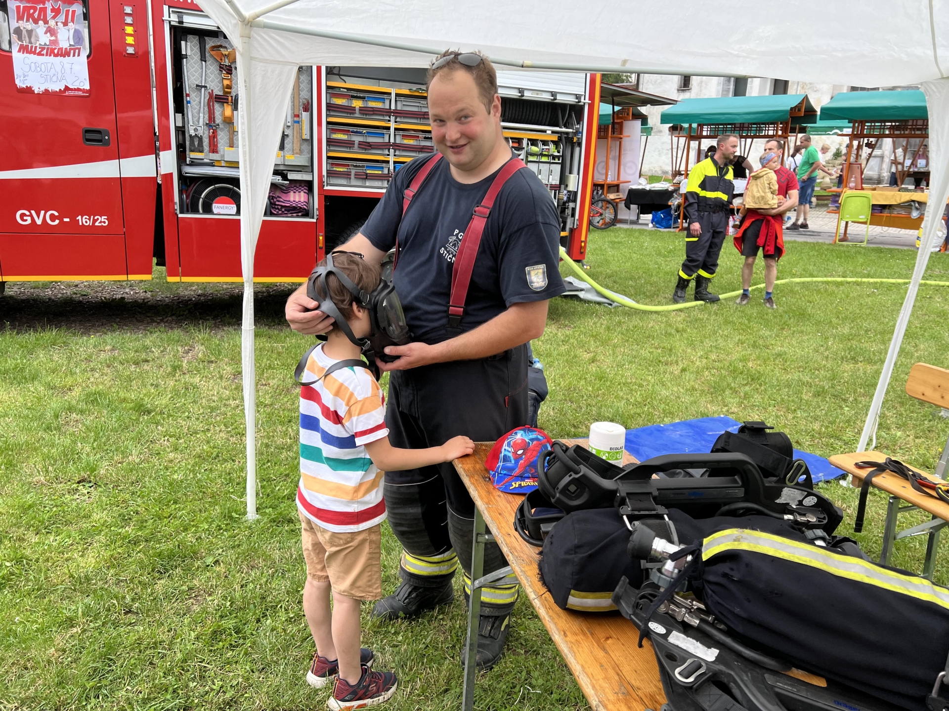 Obiskovalci so si nadeli tudi intervencijsko obleko in čelado, nekateri pa tudi izolirni dihalni aparat (IDA), s katerim si gasilci pomagamo pri dihanju v notranjih požarih.