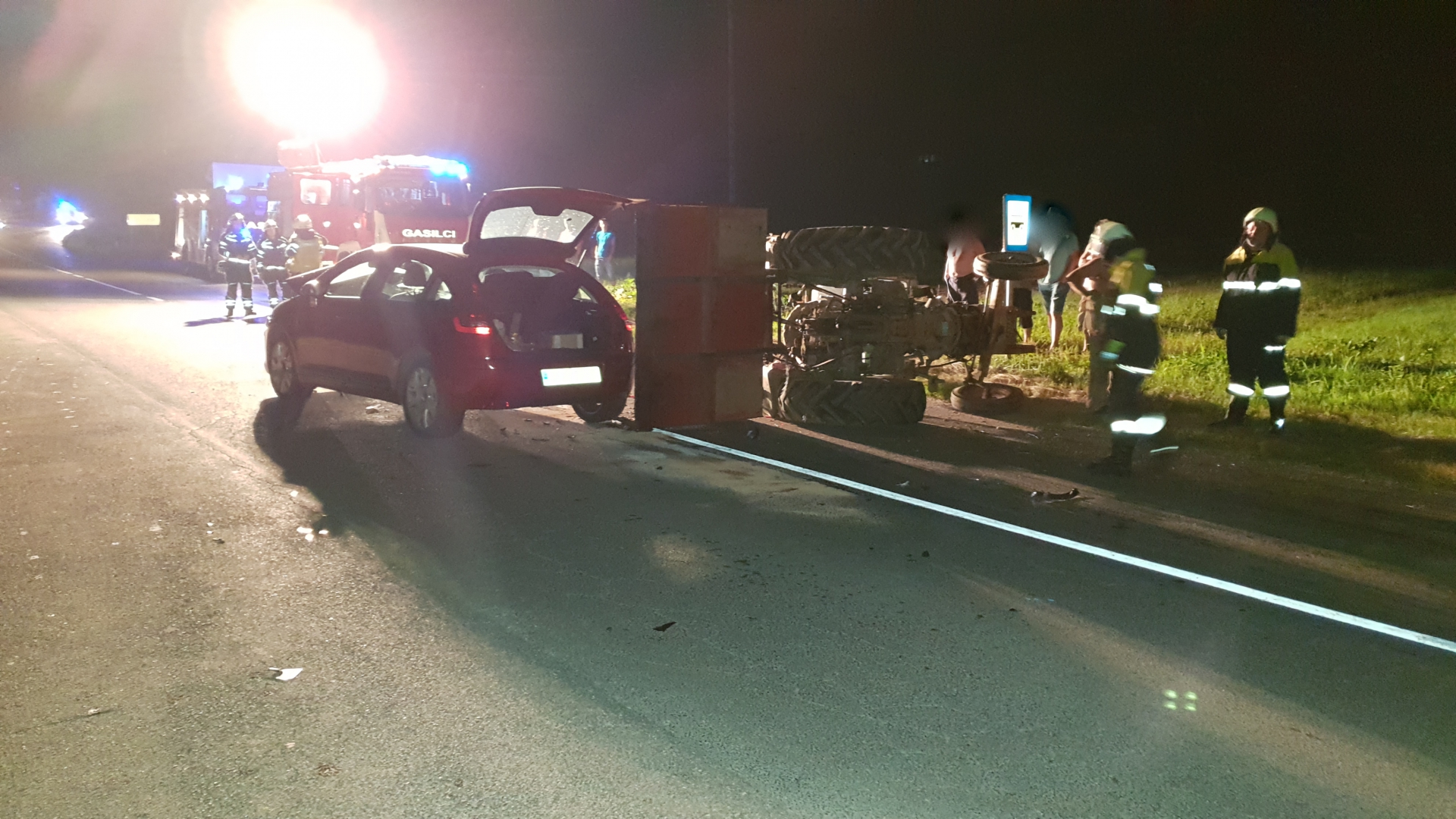 Ob 21.20 je na magistralni cesti skozi naselje Velike Lese v občini Ivančna Gorica osebni avto med prehitevanjem zadel traktor in ga zvrnil. Gasilci GB Ljubljana in PGD Stična so z vitlom povlekli traktor na kolesa. Lažje poškodovanega voznika osebnega vozila so reševalci oskrbeli in prepeljali v bolnišnico. Delavci Cestnega podjetja Novo mesto so cesto očistili.
