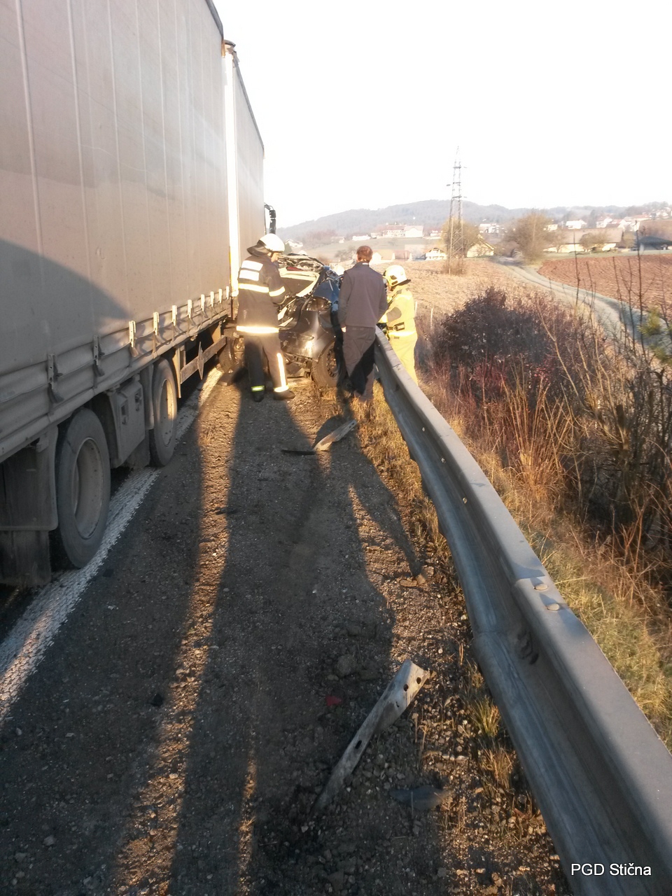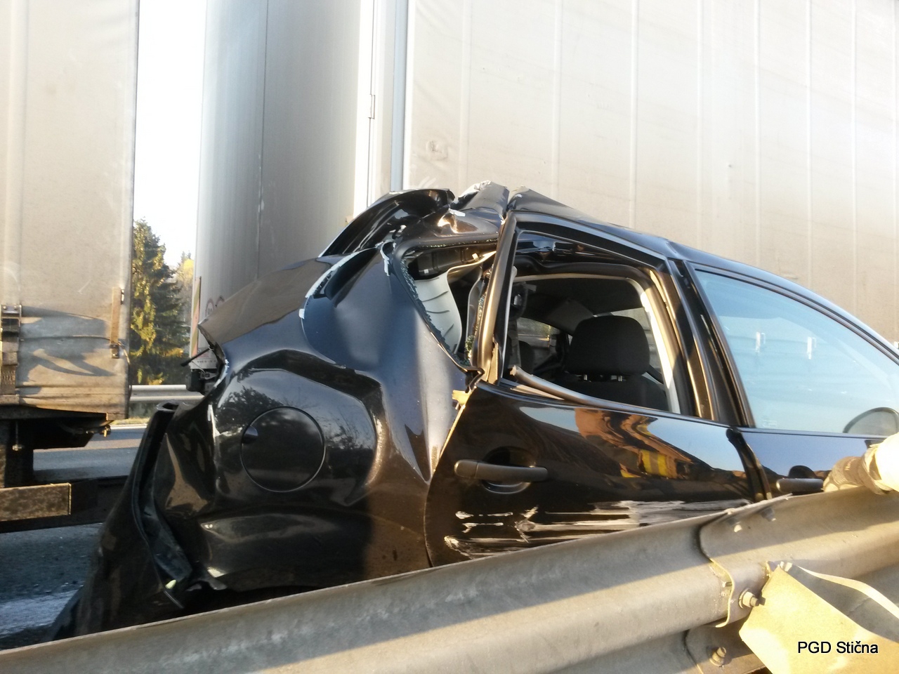 Ob 7.32 sta na avtocesti iz smeri Višnje Gore proti Grosuplju, občina Ivančna Gorica, trčili tovorno in osebno vozilo. Gasilci PGD Stična in GB Ljubljana som zavarovali kraj nesreče, odklopili akumulator na poškodovanem osebnem vozilu in posuli razlite motorne tekočine z vpojnimi sredstvi. Reševalci RP Ljubljana so preventivno pregledali osebo udeleženo v prometni nesreči.