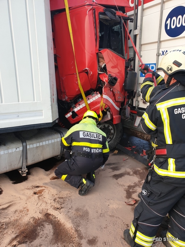 Voznik v enem izmed vlačilcev je ostal ukleščen v vozilu.