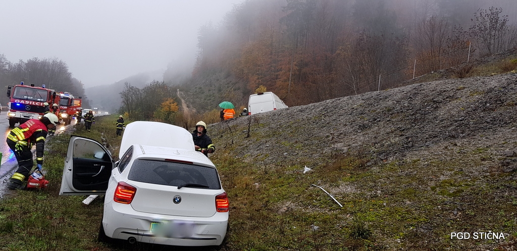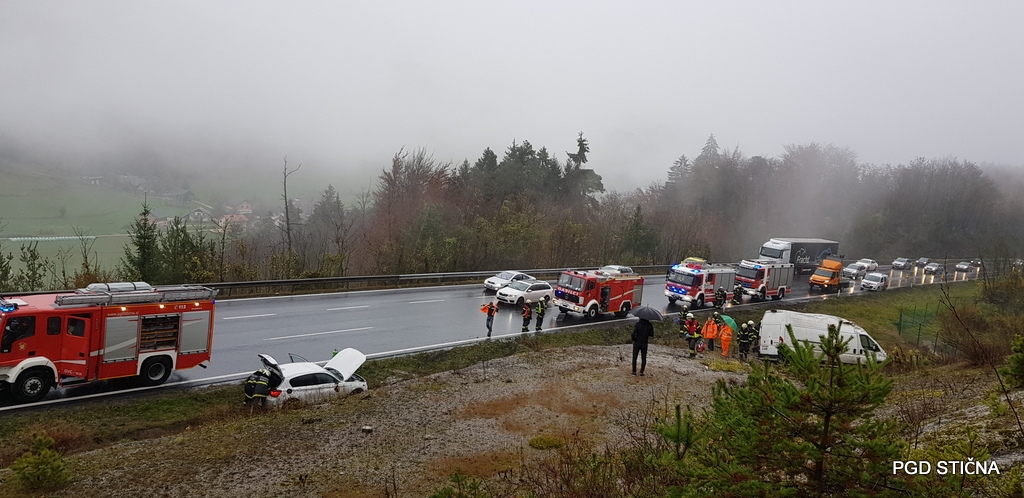 Ob 14.53 sta na višnjegorskem klancu na avtocesti proti Ljubljani, občina Ivančna Gorica, trčili osebni vozili in se prevrnili na brežino.
