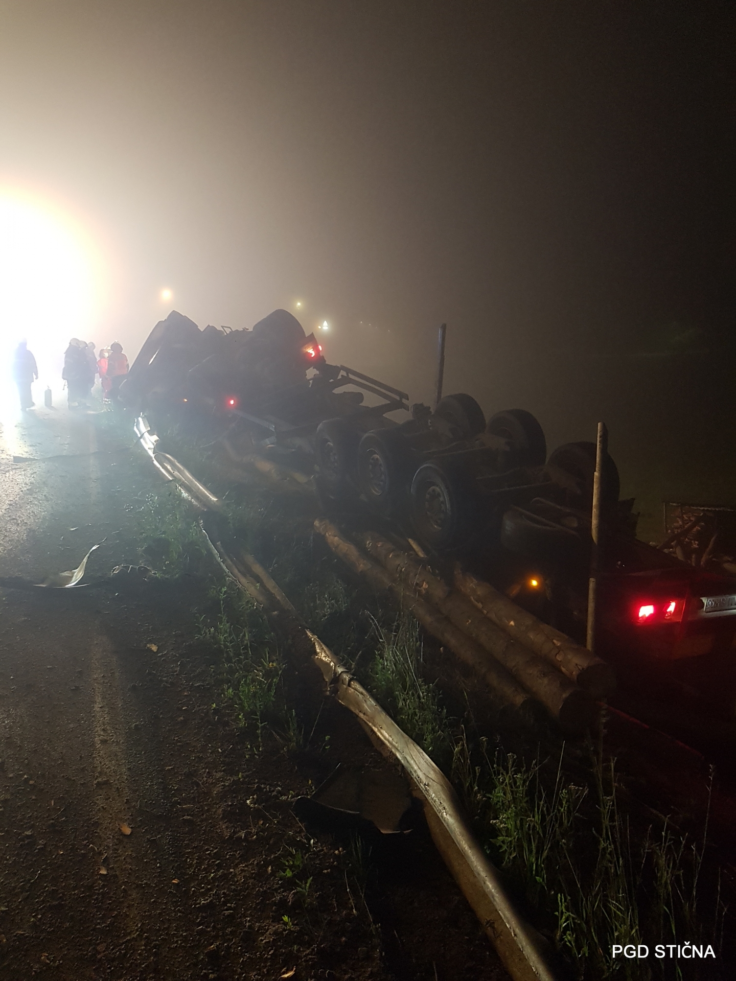 Ob 0.52 je na Muljavi, občina Ivančna Gorica, tovorno vozilo s prikolico naloženo s hlodovino, zapeljalo s cestišča in se prevrnilo.
